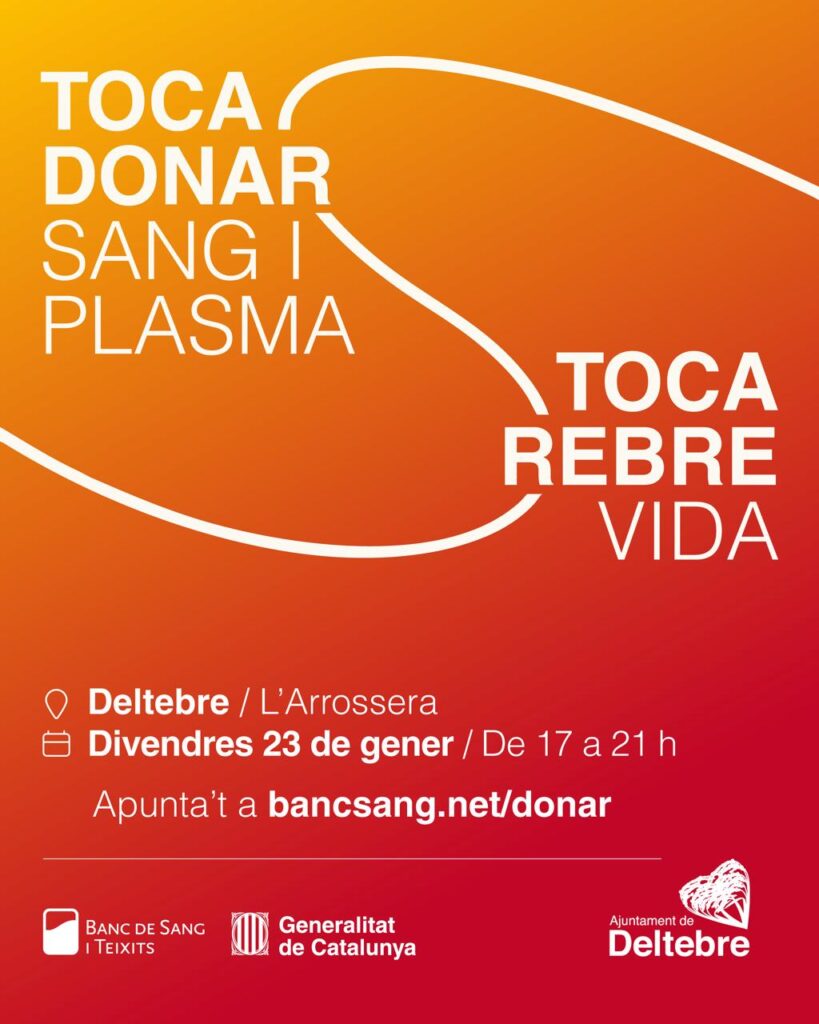 Aquest divendres 23 de gener, Deltebre acull una nova jornada de donació de sang i plasma. De 17 a 21 h a L'Arrossera. Inscripcions: bancsang.net/donar