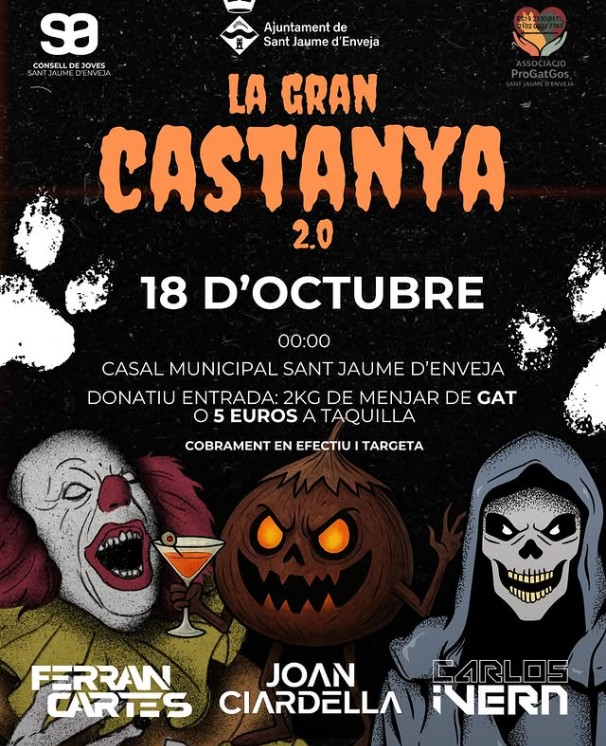 El Consell de Joves i la protectora ProGatGos uneixen forces per fer-vos viure una nit única i solidària. El 18 d’octubre torna La Gran Castanya 2.0. Gaudeix de la millor música mentre col·labores amb una bona causa! L'entrada pot ser un donatiu en forma de menjar per a gats (mínim 2kg) o 5 € a taquilla.