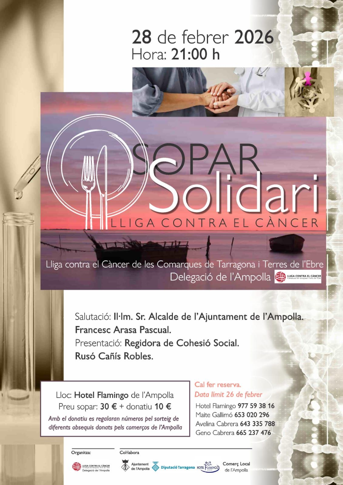 Sopar solidari de la Lliga contra el CàncerL’Ajuntament de l’Ampolla dona suport al sopar solidari organitzat per la Lliga contra el Càncer, que tindrà lloc el dissabte 28 de febrer, a les 21.00 h, a l’Hotel Flamingo de l’Ampolla.El preu del sopar és de 30 €, amb un donatiu addicional de 10 €, destinat íntegrament […]