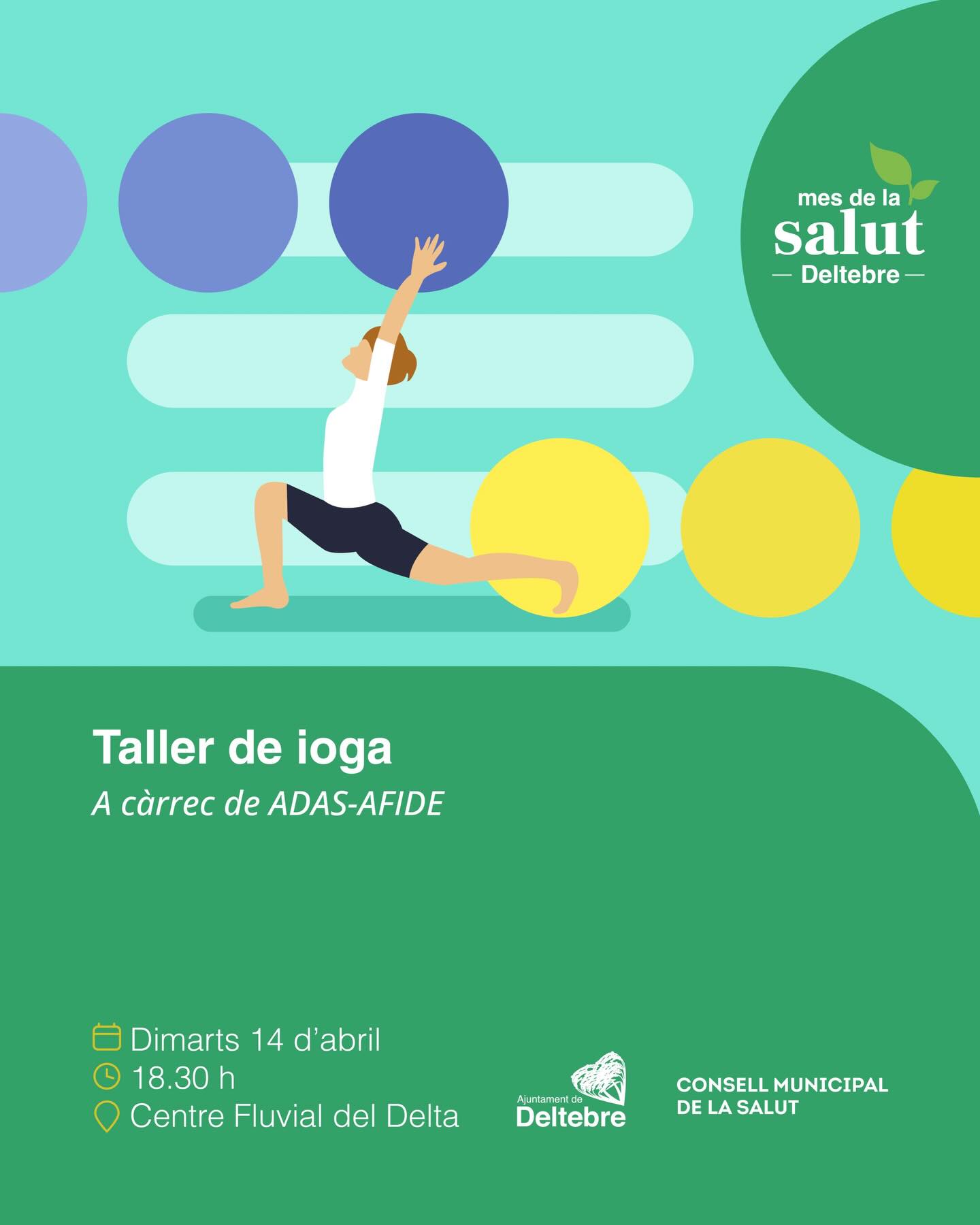 En el marc del Mes de la Salut, es durà a terme un taller de ioga a càrrec d’ADAS-AFIDE, una oportunitat per millorar el benestar físic i emocional. El dimarts 14 d’abril a les 18.30 h al Centre Fluvial del Delta.