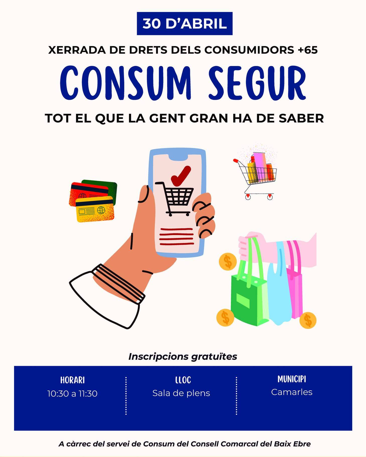 El dijous 30 d'abril, de 10:30 h a 11:30 h, a la Sala de plens de Camarles. Inscripcions gratuïtes. A càrrec del servei de Consum del Consell Comarcal del Baix Ebre.