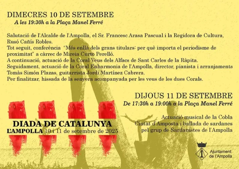 Actes del 10 i 11 de setembre per a commemorar el Dia Nacional de Catalunya a L'Ampolla: El dimecres 10 de setembre, a les 19.30 h a la plaça Manel Ferré, començaran els actes amb la salutació institucional de l’alcalde Francesc Arasa i la regidora de Cultura, Rusó Cañís. Seguidament, tindrà lloc la conferència “Més […]