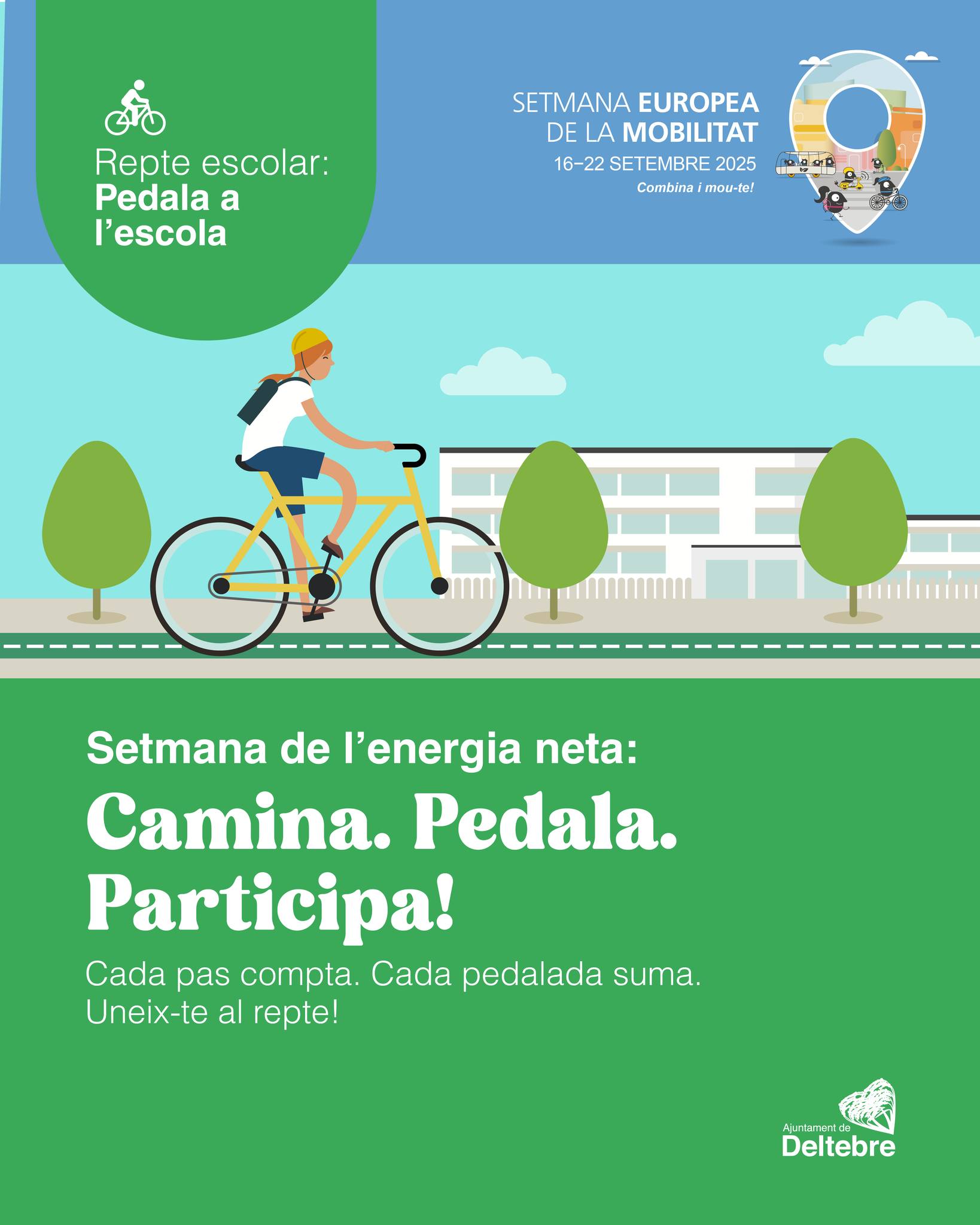 En el marc de la Setmana Europea de la Mobilitat, aquesta setmana sumem passos i pedalades per un Deltebre més sostenible. Participa en el repte escolar "Pedala a l’escola" i ajuda’ns a conscienciar sobre la importància de moure’ns d’una manera saludable i respectuosa amb el medi ambient.