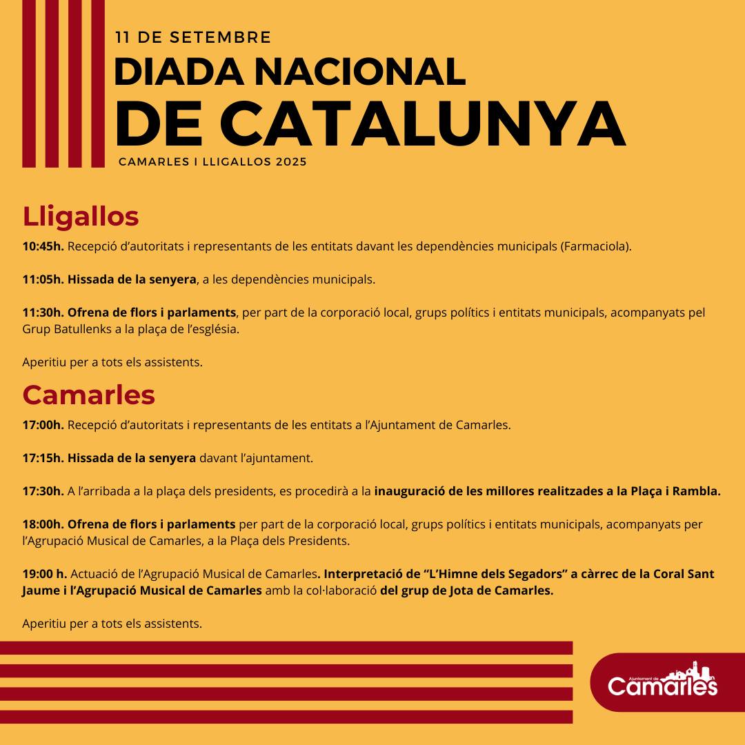 Ja està aquí el programa d'actes de la Diada Nacional de Catalunya a Camarles i Lligallos. A més, coincidint amb la Diada, es farà la inauguració de les millores realitzades a la plaça i a la rambla dels presidents. Reserveu la data per viure aquesta jornada de germanor, cultura i país.