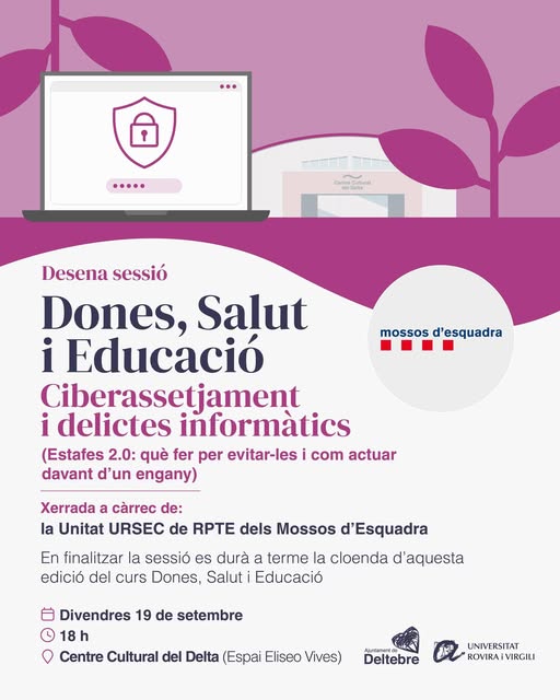 Com podem protegir-nos del ciberassetjament i de les estafes 2.0? Aquest divendres 19 de setembre, a les 18 h, al Centre Cultural del Delta (Espai Eliseo Vives), tindrà lloc la desena sessió del curs Dones, Salut i Educació. La Unitat URSEC de RPTE dels Mossos d’Esquadra ens oferirà una xerrada sobre ciberassetjament i delictes informàtics, […]