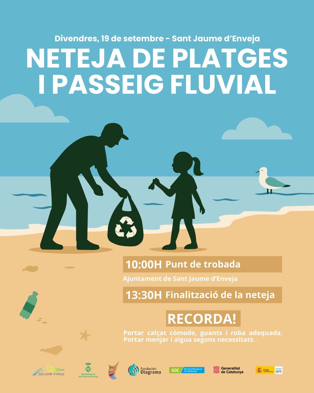 Aquest divendres, 19 de setembre tindrà lloc la neteja de platges i de la zona del passeig fluvial, organitzada per la Fundació Diagrama, amb col·laboració de l'Ajuntament de Sant Jaume i de l'Escola Sant Jaume. Ens veiem a les 10.00h a l'Ajuntament de Sant Jaume d'Enveja.