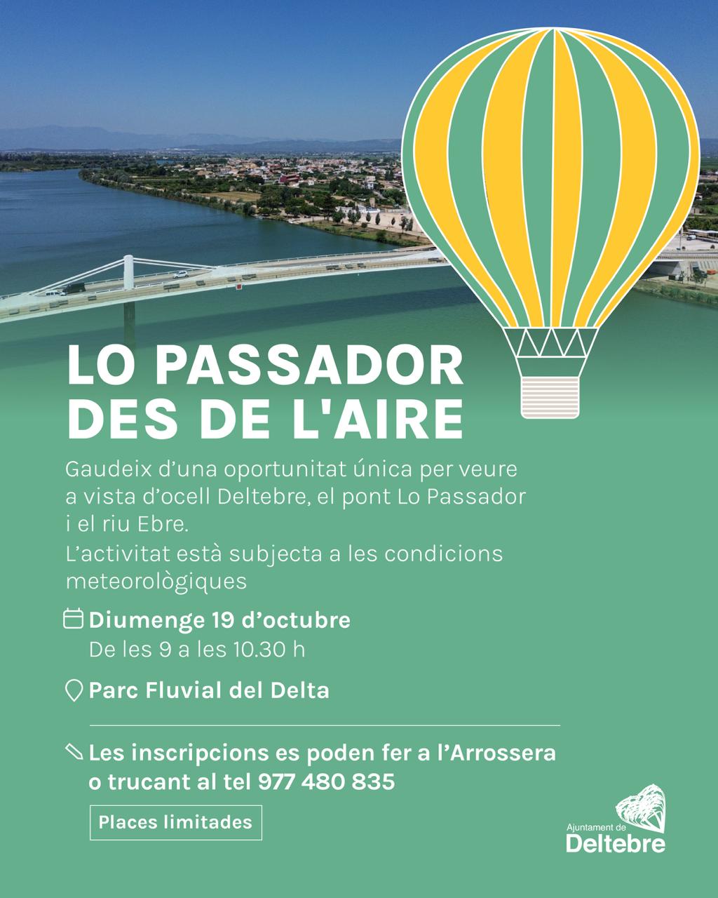 Aquest diumenge podràs gaudir d’una experiència única per veure Lo Passador, el riu Ebre i Deltebre a vista d’ocell! Diumenge 19 d’octubre De les 9 a les 10.30 h (torns de cinc minuts de durada) Parc Fluvial del Delta Inscripcions a l’Arrossera o al 977 480 835 Places limitades i activitat subjecta a condicions meteorològiques.