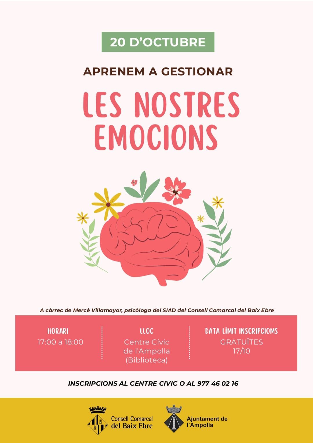 El proper dilluns 20 d’octubre, la psicòloga del SIAD, Mercè Villamayor, oferirà la xerrada “Aprenem a gestionar les nostres emocions”, adreçada a totes aquelles persones que vulguin comprendre millor les pròpies emocions i aprendre eines per gestionar-les de manera saludable. A les 17 h al Centre Cívic amb inscripció gratuïta al mateix centre.