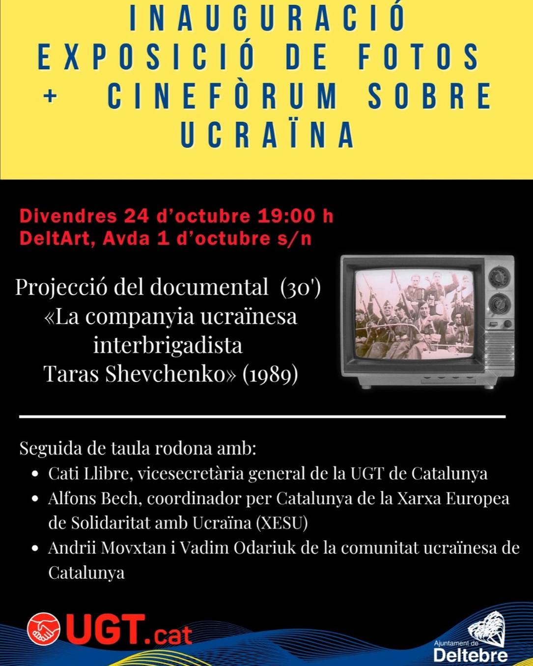 El divendres vinent, 24 d’octubre a les 19 h, us espera a DeltArt la inauguració de l’exposició fotogràfica i cinefòrum sobre Ucraïna que impulsa la UGT. Es projectarà el documental “La companyia ucraïnesa interbrigadista Taras Shevchenko” (1989), seguit d’una taula rodona amb: Cati Llibre, vicesecretària general de la UGT de Catalunya Alfons Bech, coordinador de la Xarxa Europea […]
