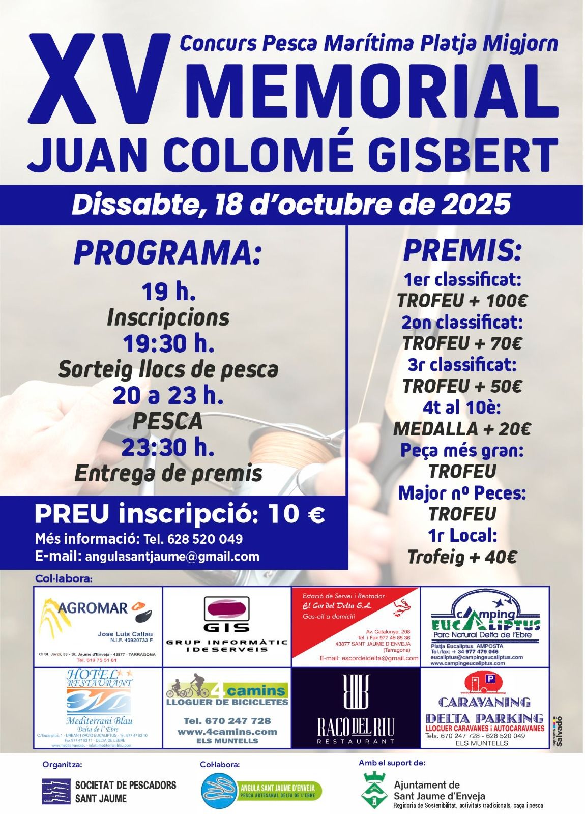 La Societat de Pescadors Sant Jaume informa que este dissabte, a la tarde/nit, tindrà lloc el Concurs de pesca marítima - XVè Memorial Juan Colomé Gisbert a la Platja Migjorn.