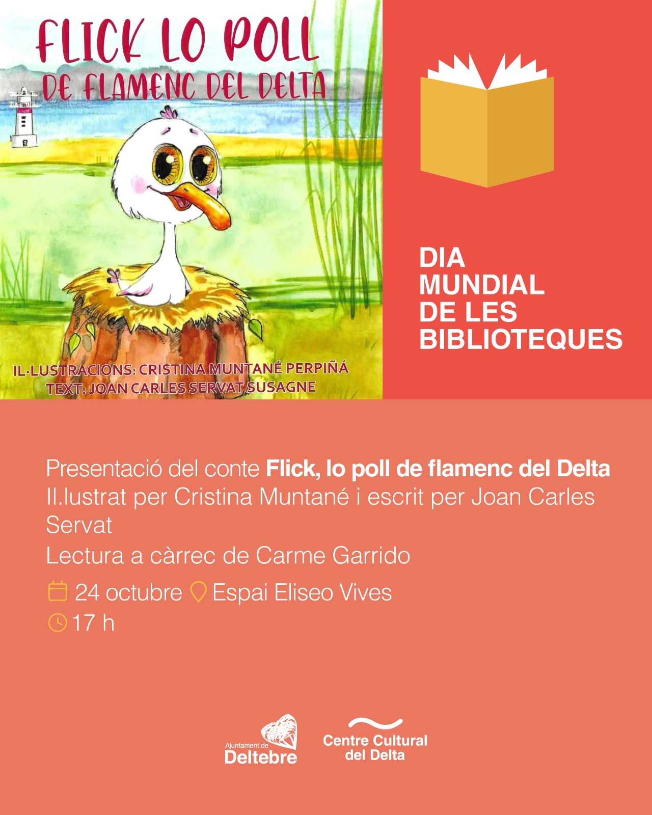 Celebrem el Dia Mundial de les Biblioteques! Aquest dijous 24 d’octubre, a les 17 h i a l’Espai Eliseo Vives, presentarem el conte "Flick, lo poll de flamenc del Delta", escrit per Joan Carles Servat i il·lustrat per Cristina Muntané. La lectura anirà a càrrec de Carme Garrido