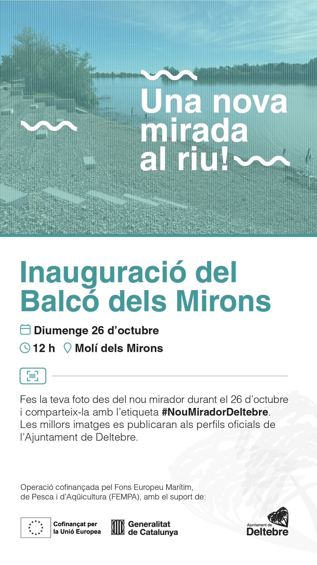 Nova data i nova hora per descobrir una nova mirada al nostre riu! Diumenge 2 de novembre, a les 12.30 h, inaugurem el Balcó dels Mirons, un nou espai per gaudir de les vistes privilegiades del riu Ebre i del nostre entorn natural. Fes la teva foto durant la jornada i comparteix-la amb l’etiqueta #NouMiradorDeltebre. Les millors […]