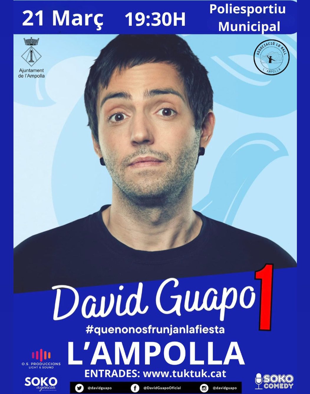 El pròxim 21 de març, el conegut humorista David Guapo portarà el seu espectacle #quenonosfrunjanlafiesta per primera vegada a l’Ampolla de la mà de l’Associació Cultural Lo Rall.