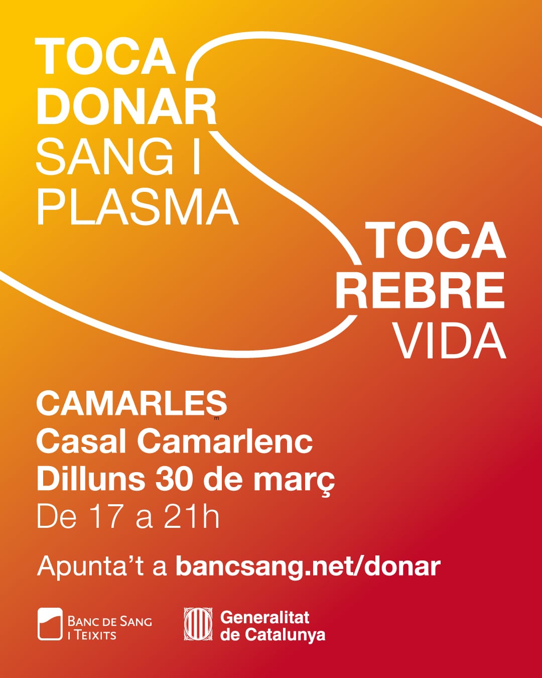 Toca donar sang i plasma! Dilluns 30 de març, de 17 a 21 h, al Casal Camarlenc.