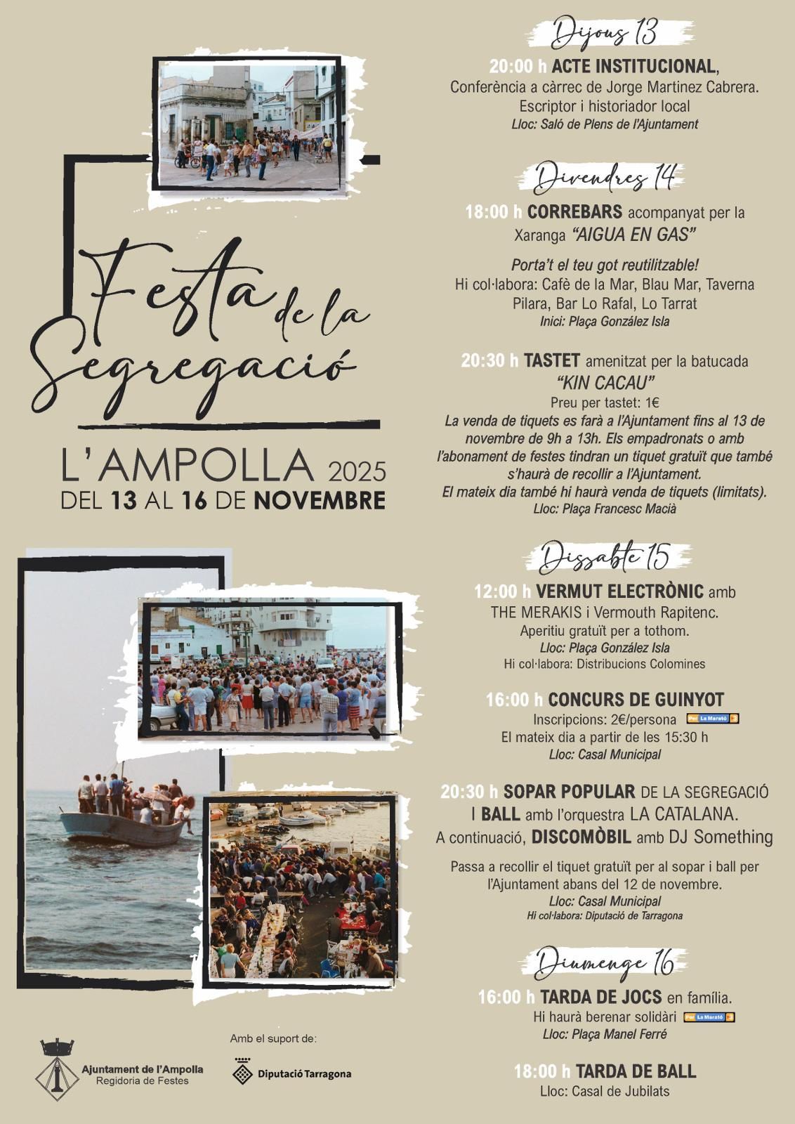 Festes de la Segregació a l’Ampolla, del dijous 13 al diumenge 16 de novembre. Un cap de setmana ple d’activitats, pots consultar el programa d’activitats al perfil oficial de l’Ajuntament.