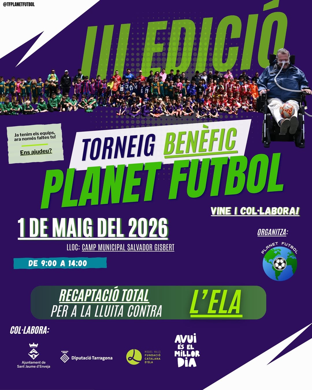 Ja arriba el 𝐭𝐞𝐫𝐜𝐞𝐫 𝐭𝐨𝐫𝐧𝐞𝐢𝐠 𝐛𝐞𝐧𝐞̀𝐟𝐢𝐜 per recaptar fons per als 𝐦𝐚𝐥𝐚𝐥𝐭𝐬 𝐝’𝐄𝐋𝐀. Un esdeveniment on el 𝐟𝐮𝐭𝐛𝐨𝐥 𝐢 𝐥𝐚 𝐬𝐨𝐥𝐢𝐝𝐚𝐫𝐢𝐭𝐚𝐭 van junts per donar suport a les 𝐩𝐞𝐫𝐬𝐨𝐧𝐞𝐬 𝐢 𝐟𝐚𝐦𝐢́𝐥𝐢𝐞𝐬 𝐚𝐟𝐞𝐜𝐭𝐚𝐝𝐞𝐬. L’1 de maig, de 9 h a 14 h, al Camp Municipal Salvador Gisbert de Sant Jaume d’Enveja.