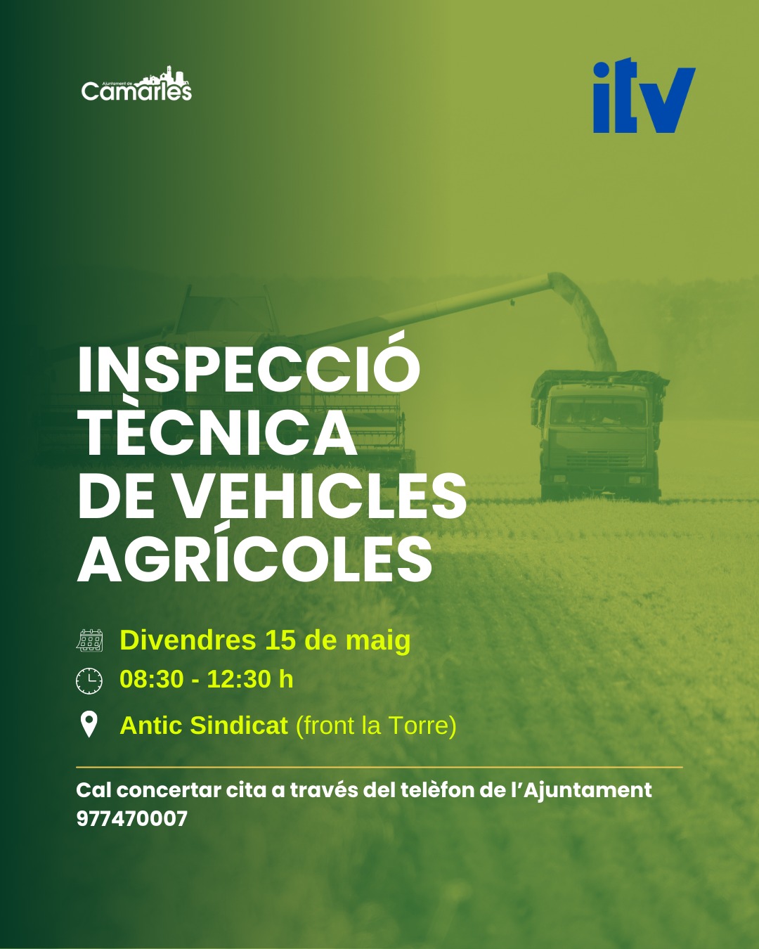 L’Ajuntament de Camarles informa que el proper divendres 15 de maig es realitzarà al municipi la Inspecció Tècnica de Vehicles (ITV) per a vehicles agrícoles, un servei que facilita que els propietaris d’aquest tipus de vehicles puguin passar la inspecció sense haver de desplaçar-se fora del municipi.