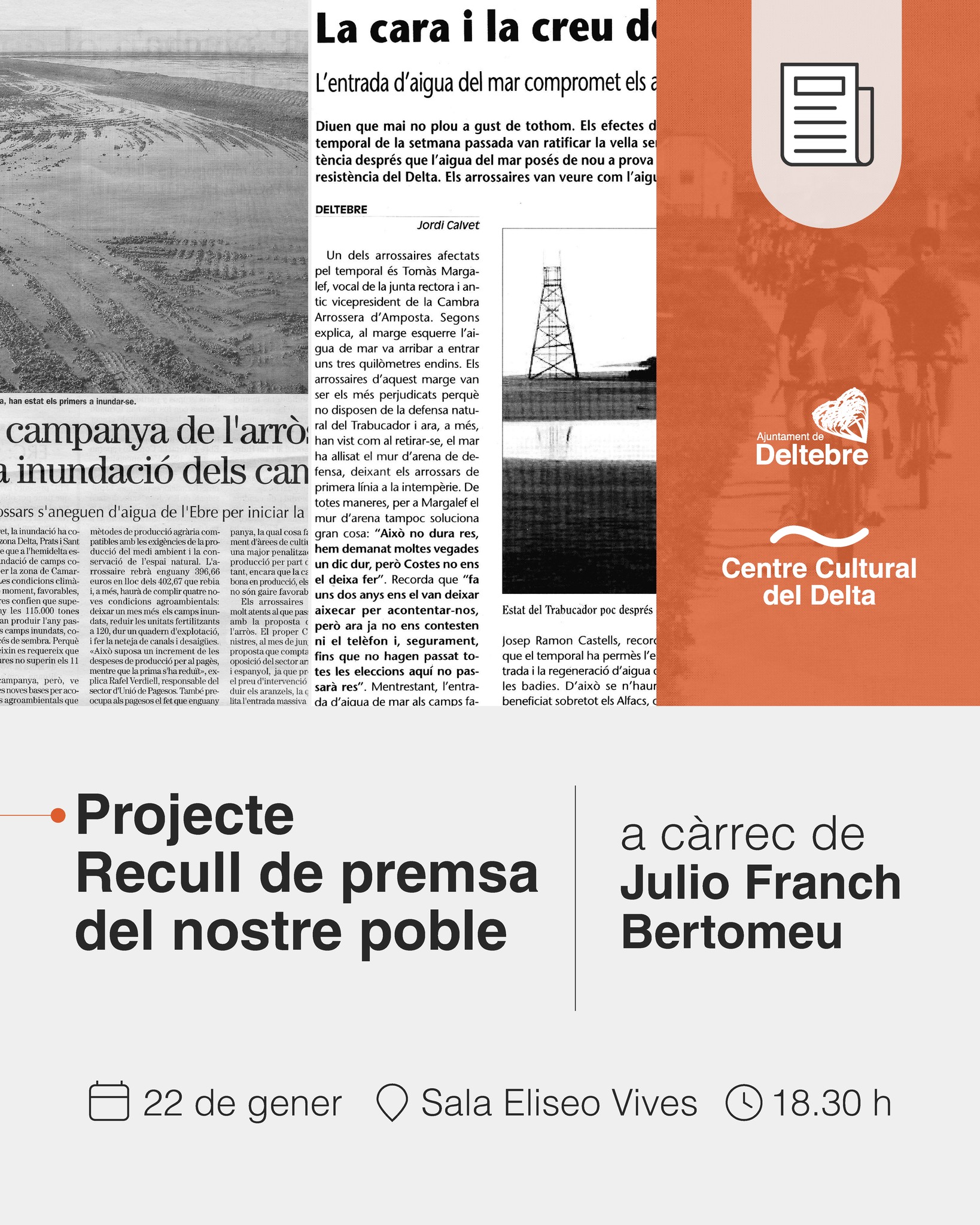 Nova edició del projecte Recull de premsa de Deltebre, que presenta Julio Franch aquest dijous 22 de gener, a partir de les 18.30 h, a la Sala Eliseo Vives del Centre Cultural del Delta.