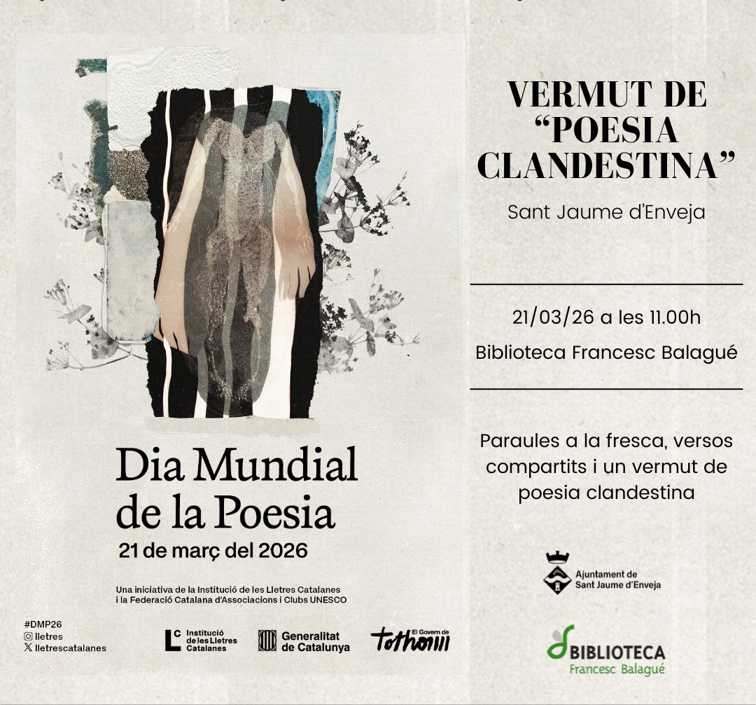 Aquest Dia Mundial de la Poesia, el pati de la biblioteca de Sant Jaume d’Enveja s’omplirà de versos, veus i bon ambient. Un vermut poètic per a grans i petits, on llegirem poemes de diversos autors i compartirem paraules que emocionen, sorprenen i fan pensar.