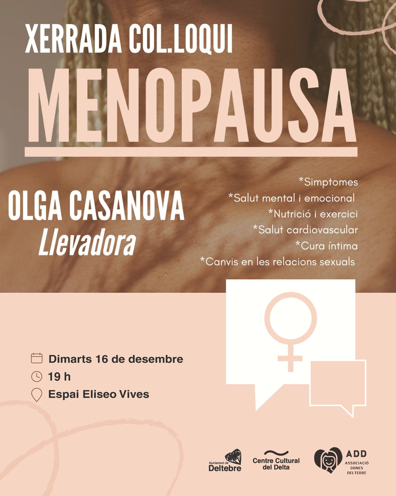 La menopausa és una etapa vital que cal abordar amb informació. Per això, us convidem a una xerrada-col·loqui a càrrec d’Olga Casanova, llevadora, on parlarem obertament de: