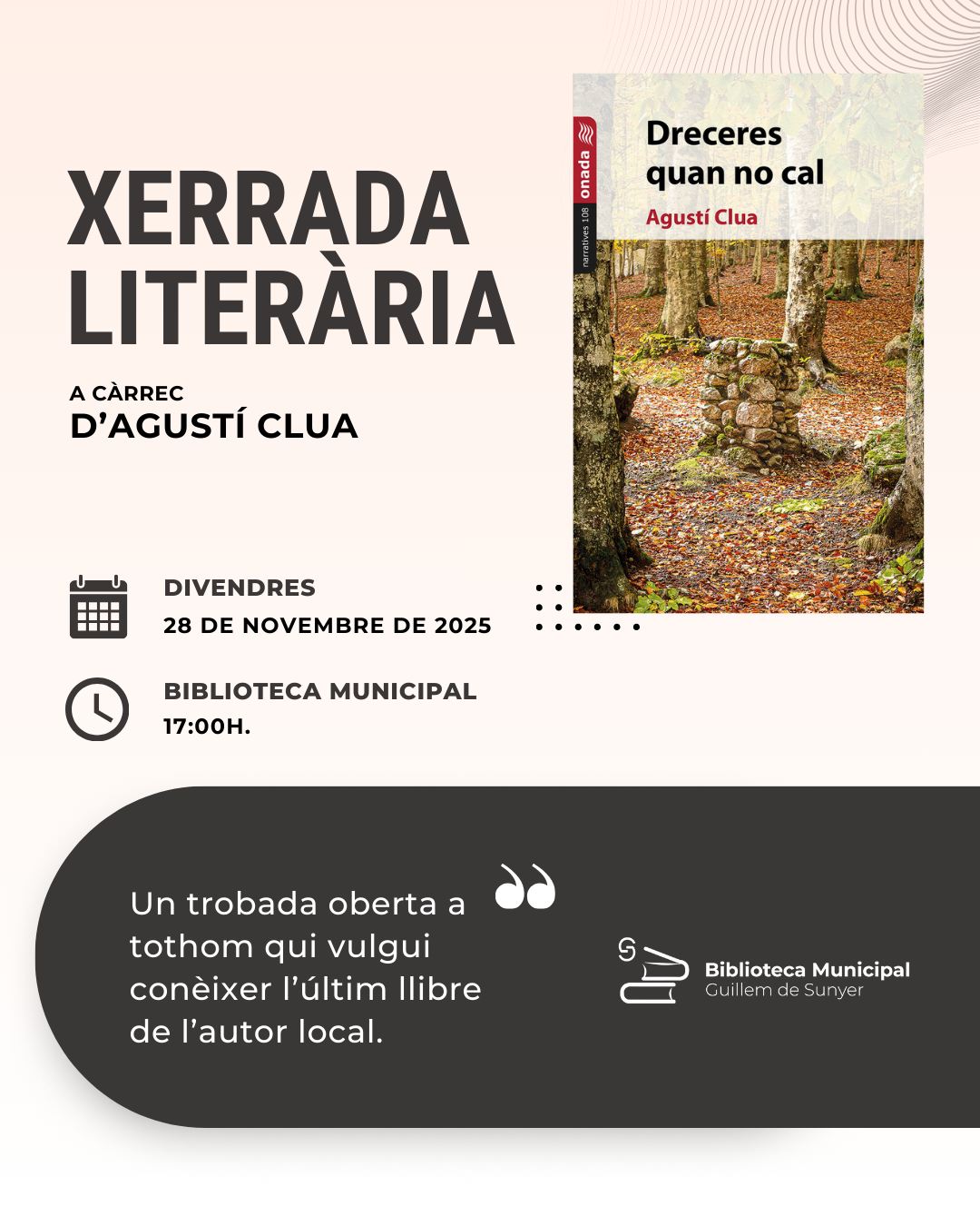 Xerrada Literària amb Agustí Clua! No et perdis aquesta trobada especial amb l’autor local Agustí Clua, que presentarà el seu nou llibre “Dreceres quan no cal”.